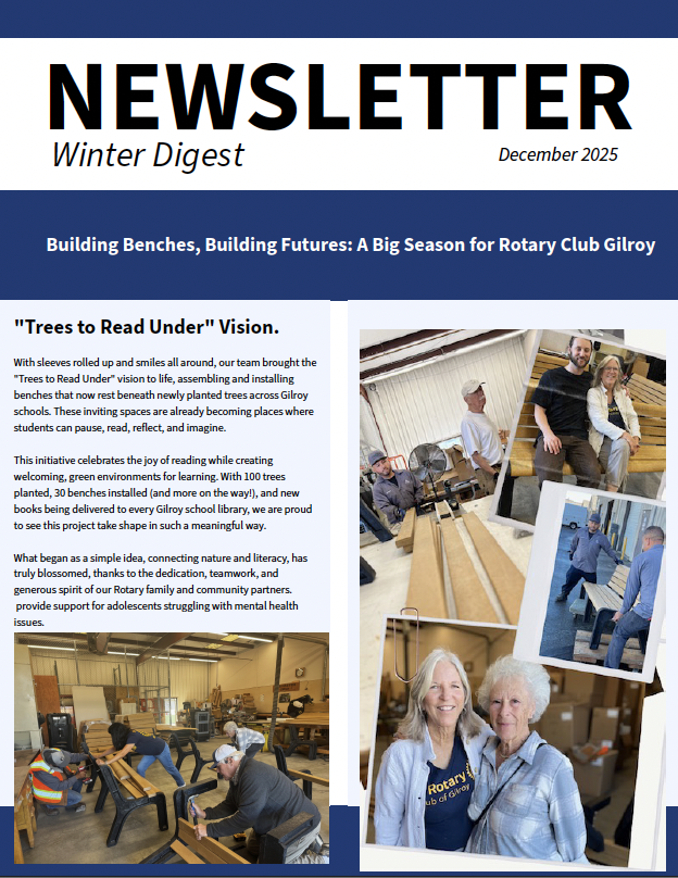 In celebration of our centennial year in 2025, Rotary Club of Gilroy is planting 100 trees, installing reading benches, and funding new books for local schools. Join this ambitious campaign and help us leave a legacy for our youth!